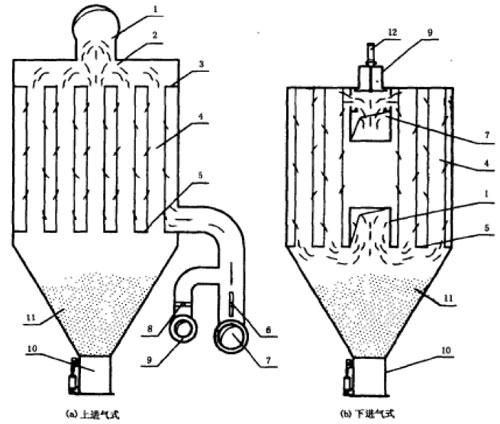 8-清灰閥;9-反吹風管;10-卸灰閥;11-灰斗;12-提升切換閥