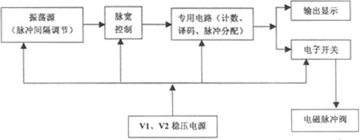本控制儀由雙時基電路CH7556的1/2作為無穩態多諧振蕩器產生周期為1~99秒的可調脈沖信號;另1/2作為單穩態電路完成計數、譯碼、脈沖分配等一系列邏輯功能,再由專用電路的各輸出端輸出所設定的脈沖寬度信號至電子開關(VMOS電路),控制電磁脈沖閥的開啟,噴吹壓縮空氣,同時由數碼管顯示噴吹順序。