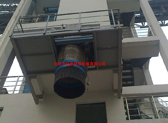 伸縮溜管采用雙層套管結構,由溜筒和防塵罩構成。溜筒內通過物料,防塵罩外套在溜筒上,期間行程吸塵腔。無塵伸縮溜管底部將設料位傳感器和防塵群罩。料位傳感器將設在外側或內側,防塵群罩將采用分塊重疊式。在裝車過程中料位傳感器接觸物料后,無塵伸縮溜管將及時提升使料頂與堆積的物料始終保持一定距離。防塵罩能罩在料堆上,以保證吸塵效果,防止粉塵外溢。溜筒將采用附有聚氨酯耐磨襯板的鋼板制成,防塵罩采用防靜電柔軟強度大的化纖材料制成。防塵罩內將設置支承骨架,既可上下伸縮,又可保證氣流通暢。伸縮溜管升降自如,無阻滯現象;在伸縮溜管底部將至少設3個吊點,以保證升降機構帶動伸縮溜管平穩(wěn)升降。伸縮溜管外形尺寸圖/外伸縮防塵罩圖片